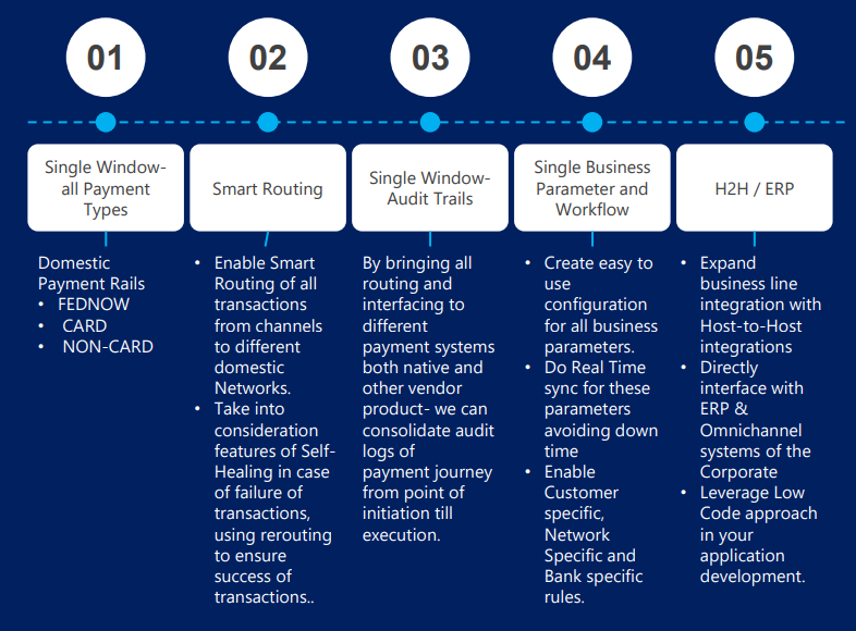 - Payment Hub facilitates processing and managing multi payment types. It serves as a centralized hub for validating, decisioning, routing, processing & monitoring payments with high efficiency, control and visibility over the entire payment process.